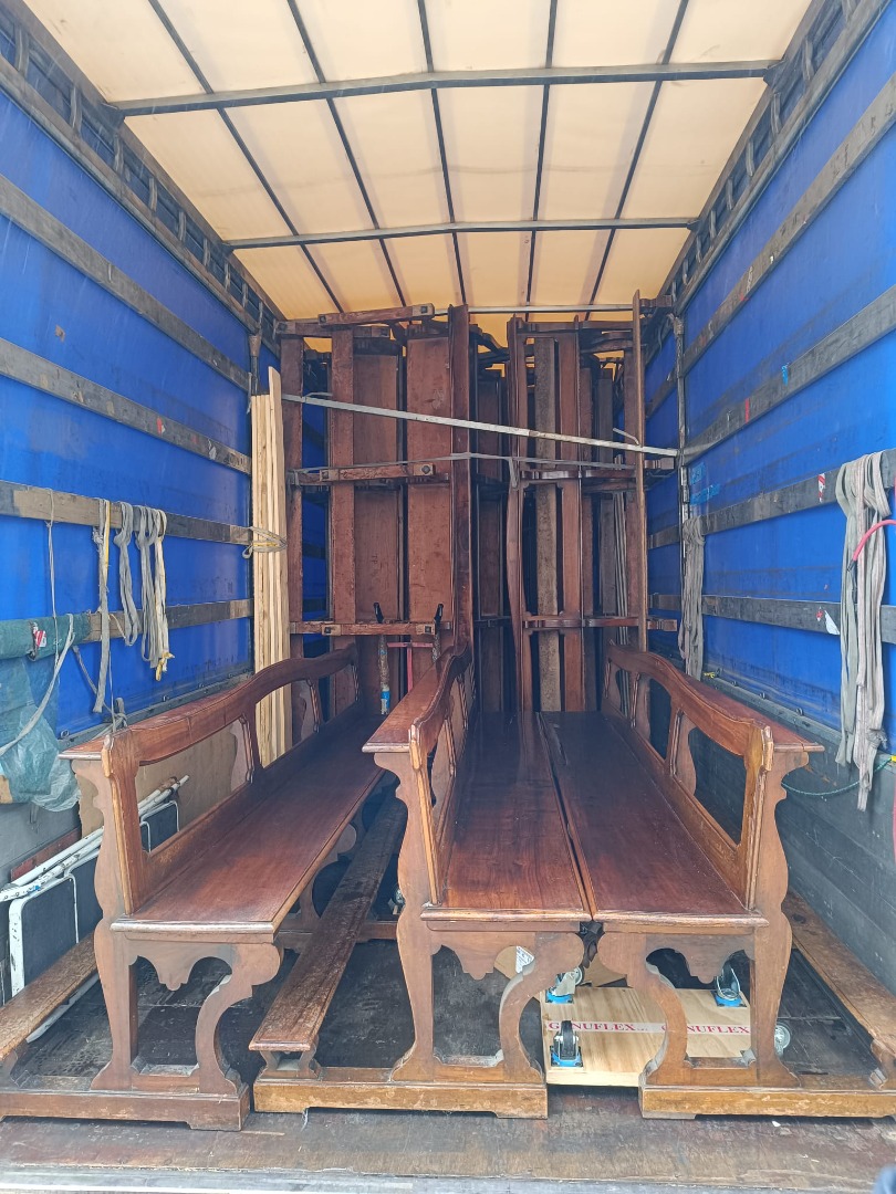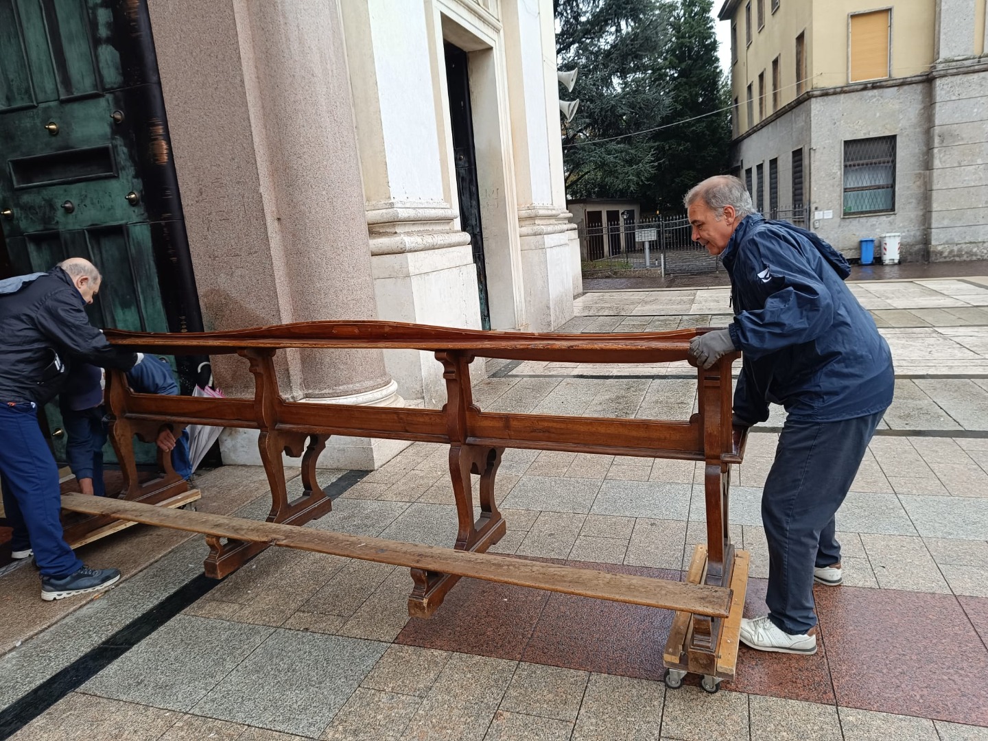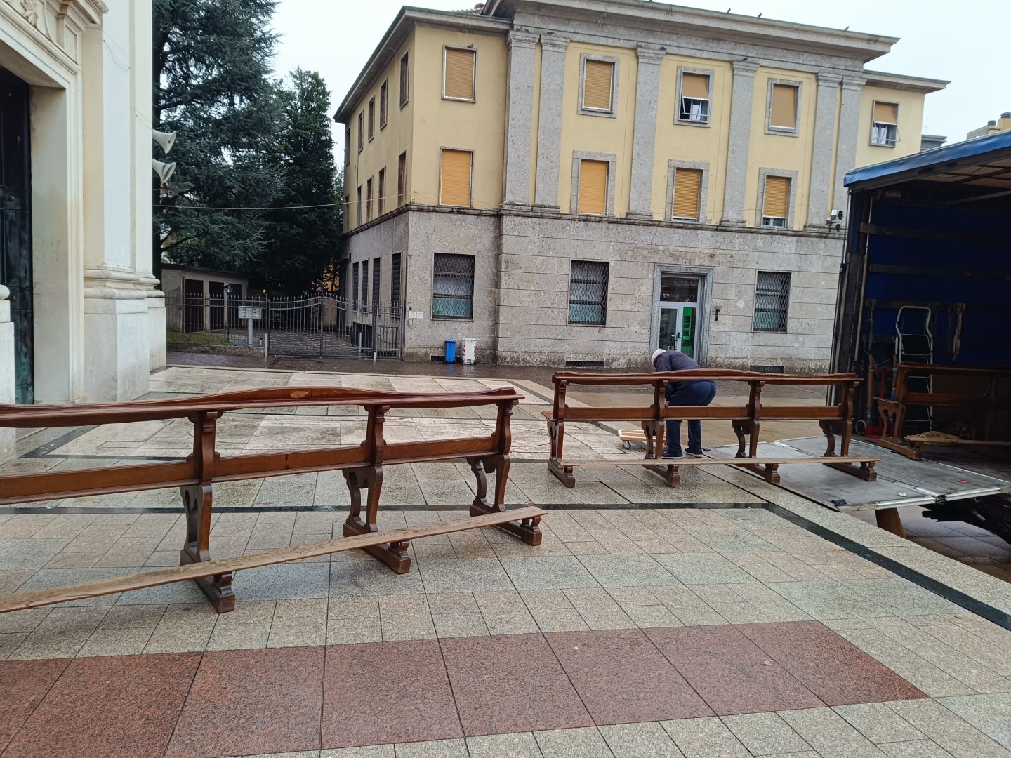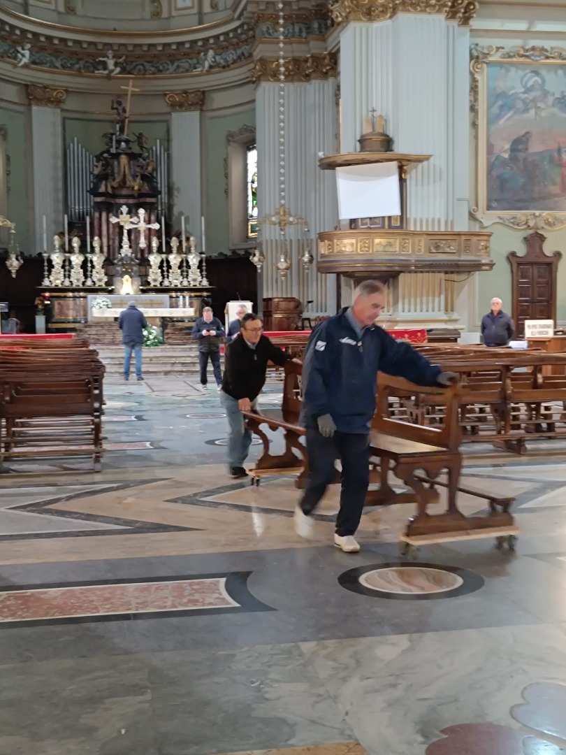 L’impresa incaricata ha organizzato il trasporto di una prima parte dei banchi, dando così avvio ai lavori di restauro degli antichi arredi in legno di noce, che da generazioni accompagnano le celebrazioni in Basilica.